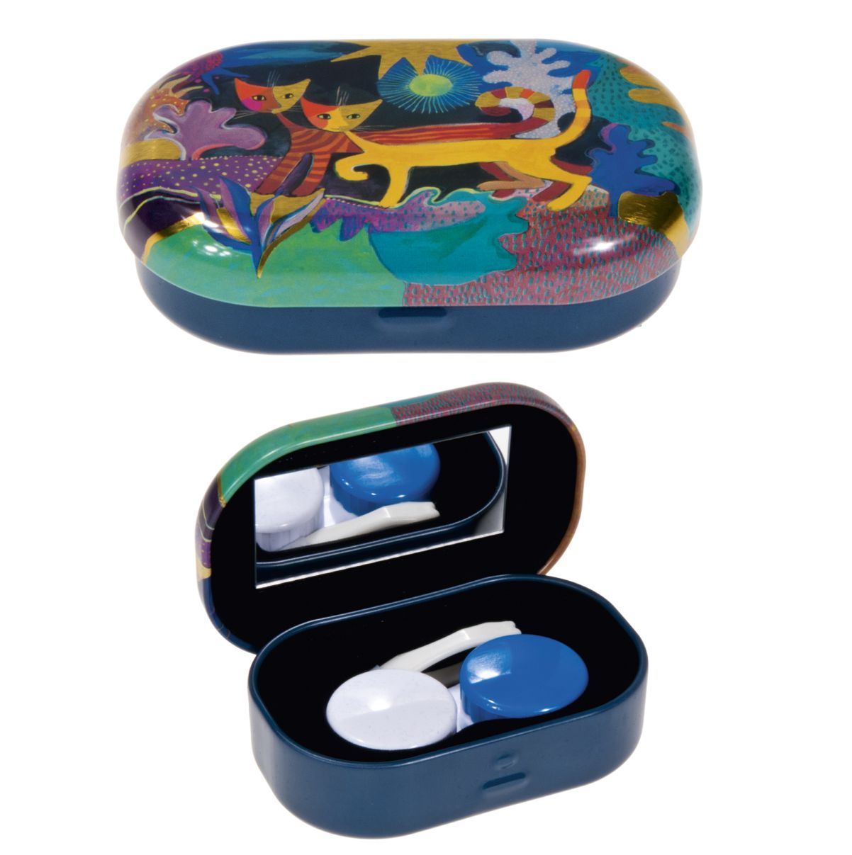 Een kleurrijk opbergdoosje met katten. Het doosje is speciaal om contactlenzen in op te bergen. De print met katten komt van het kunstwerk Wonderland van Rosina Wachtmeister. Deze kunstenares staat bekend om haar inspirerende werken met katten en poezen.